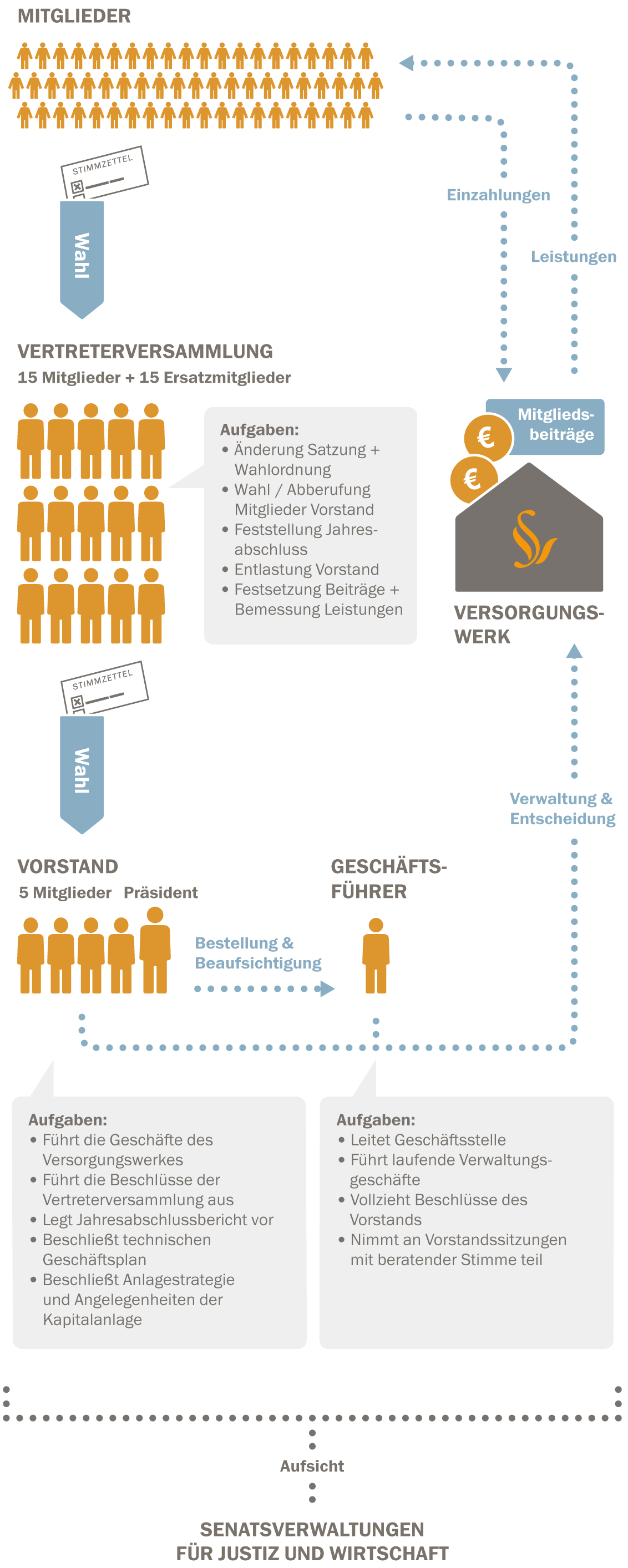 Als Körperschaft des öffentlichen Rechts steht das Versorgungswerk unter der Rechtsaufsicht der Senatsverwaltung für Justiz und einer Fachaufsicht für die Belange des Vermögens und der Versicherungsmathematik durch die Senatsverwaltung für Wirtschaft.